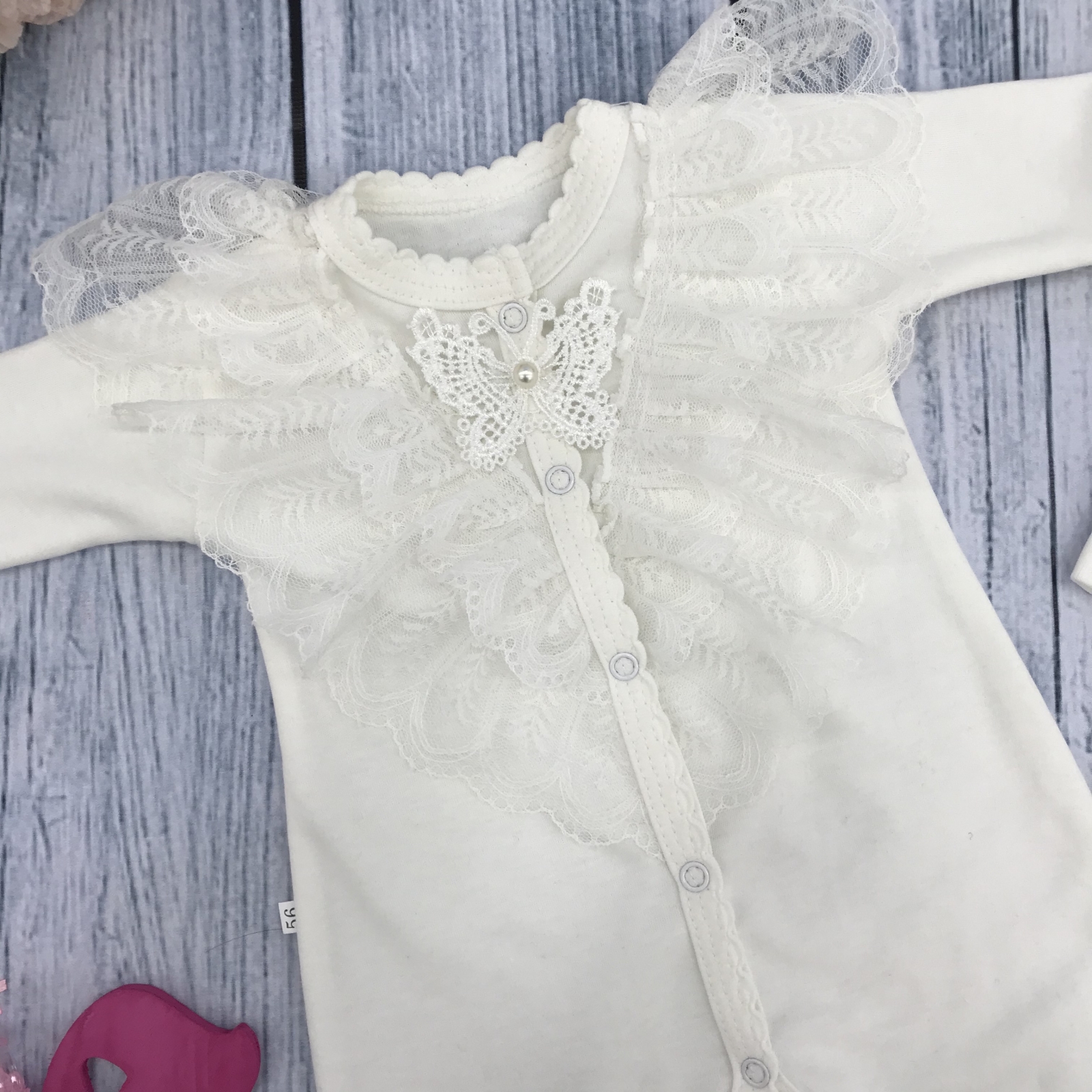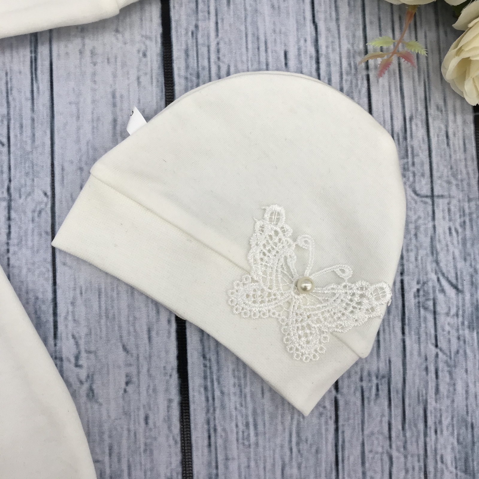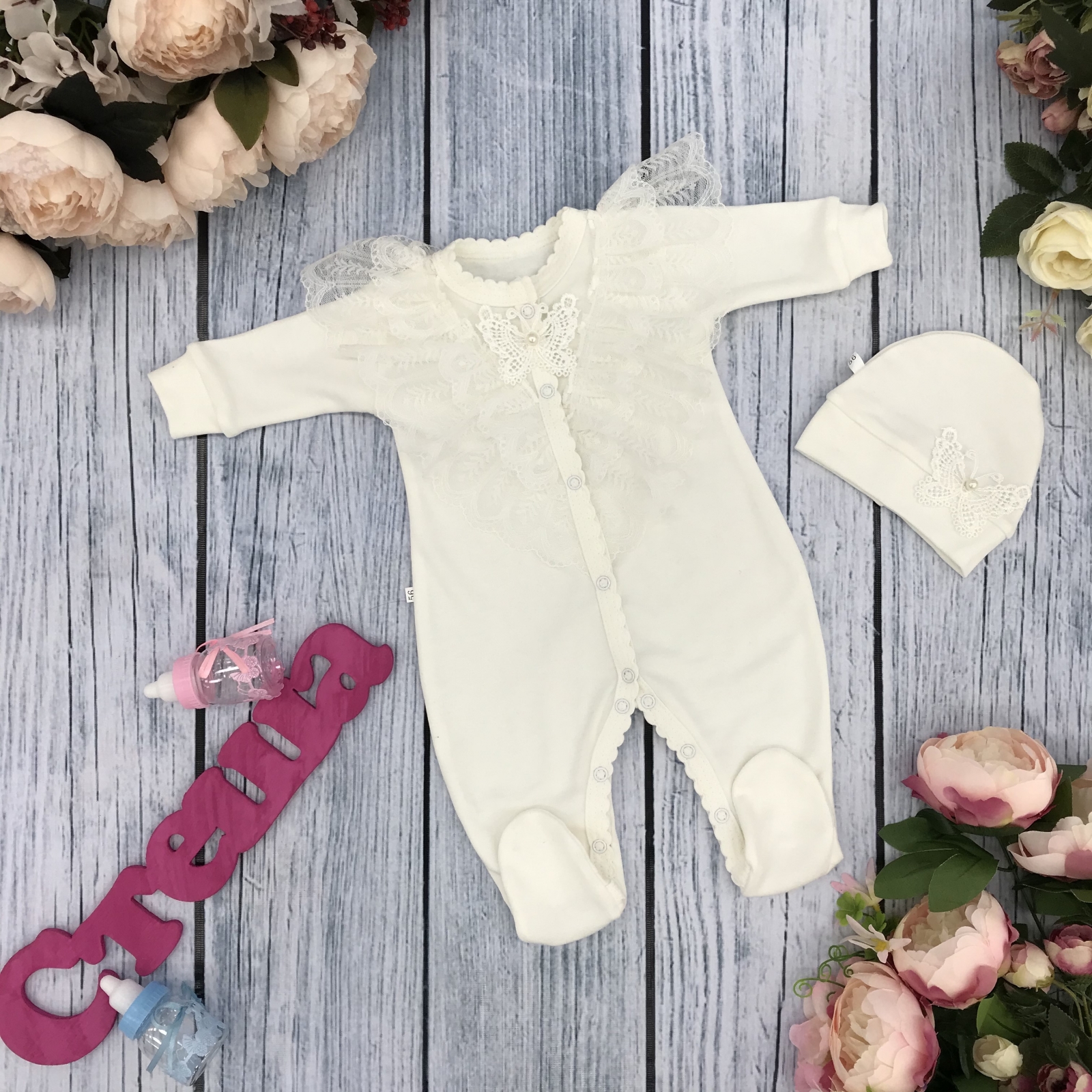 Комбинезон + шапка из интерлока-пенье , украшен красивым кружевом