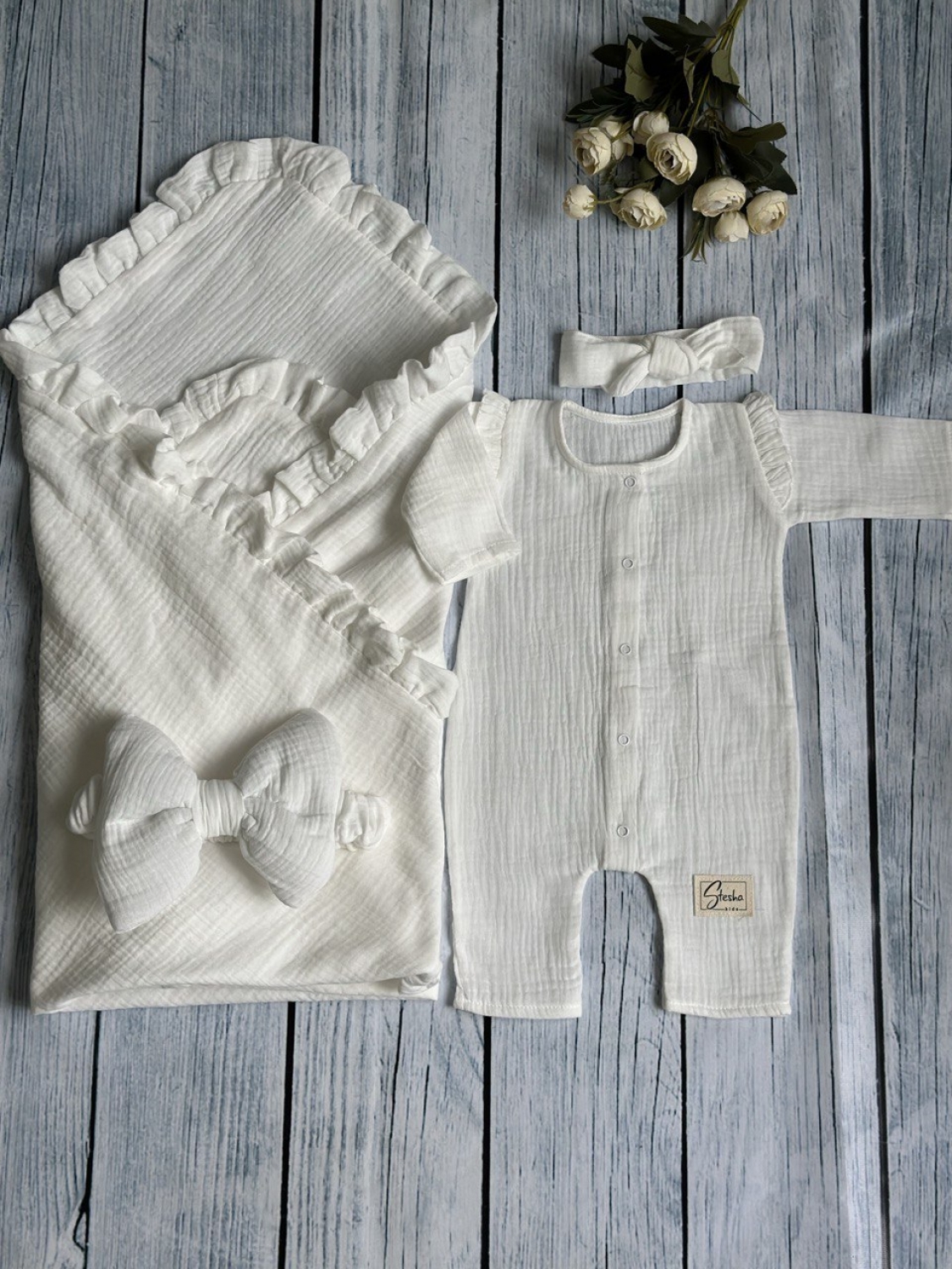 Теги: Купить детские конверты, комбинезон оптом, детские конверты на выписку оптом. 335-М. Комплект из детского комбинезона, р 56 и конверта муслин, хлопок 100% 90/90 см, молочный цена,отзывы официальный сайт "Стеша Оренбург"